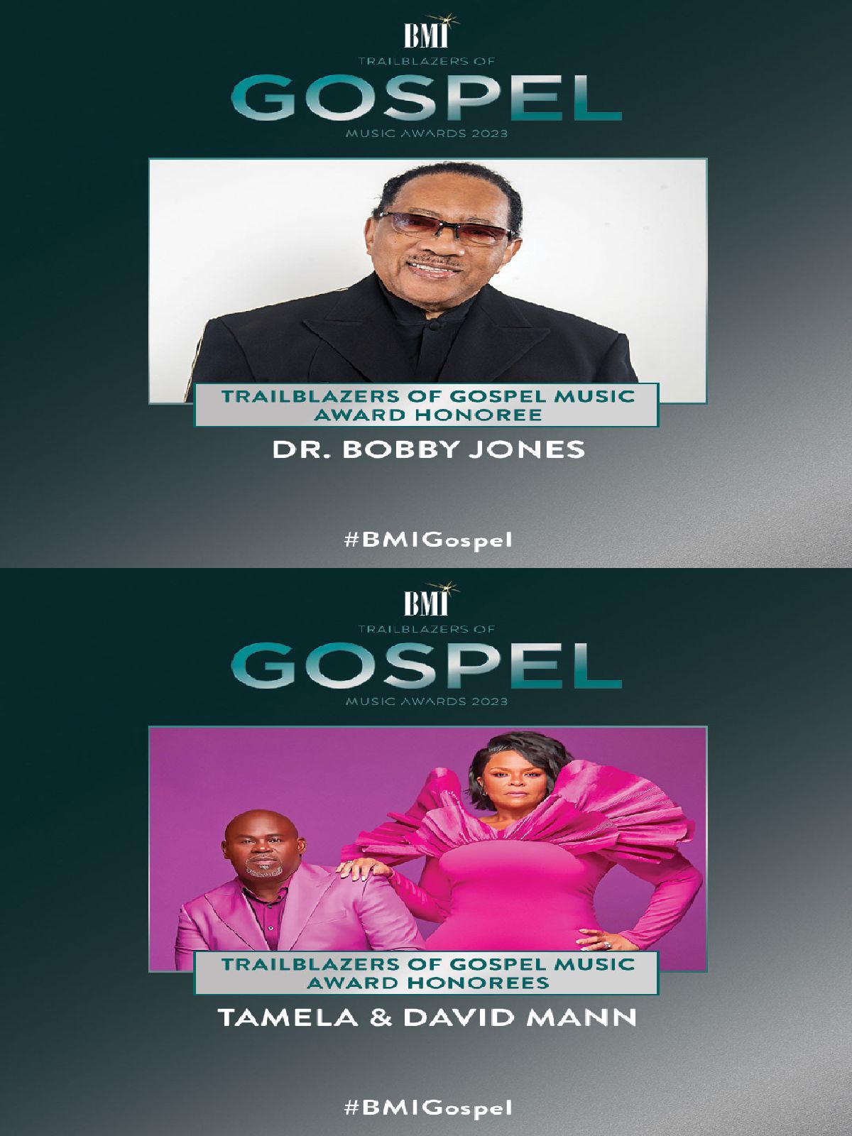 BMI (Broadcast Music, Inc.) will honor Gospel superstars Tamela and David Mann and Dr. Bobby Jones at its 22nd Annual Trailblazers of Gospel Music Awards to be held at Flourish Atlanta on March 30th.