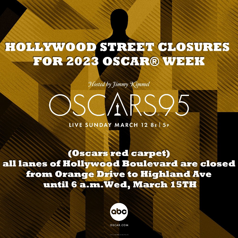 To accommodate the construction of press risers and pre-show stages along the Oscars red carpet, all lanes of Hollywood Boulevard are closed from Orange Drive to Highland Avenue until 6 a.m. on Wednesday, March 15, 2023.